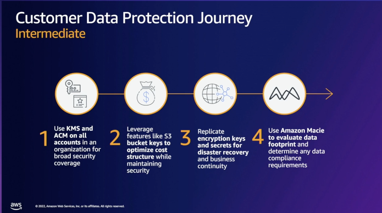 The intermediate level for data protection implementation in AWS involves enforcing the use of KMS and AWS Certificate manager acorss all accounts within your AWS organization, enabling the use S3 keys for cost optimization, Replicating KMS keys and secrets across regions for disaster recovery, and enabling the use of Amazon Macie to review data store in S3 and check for compliance with existing policies.