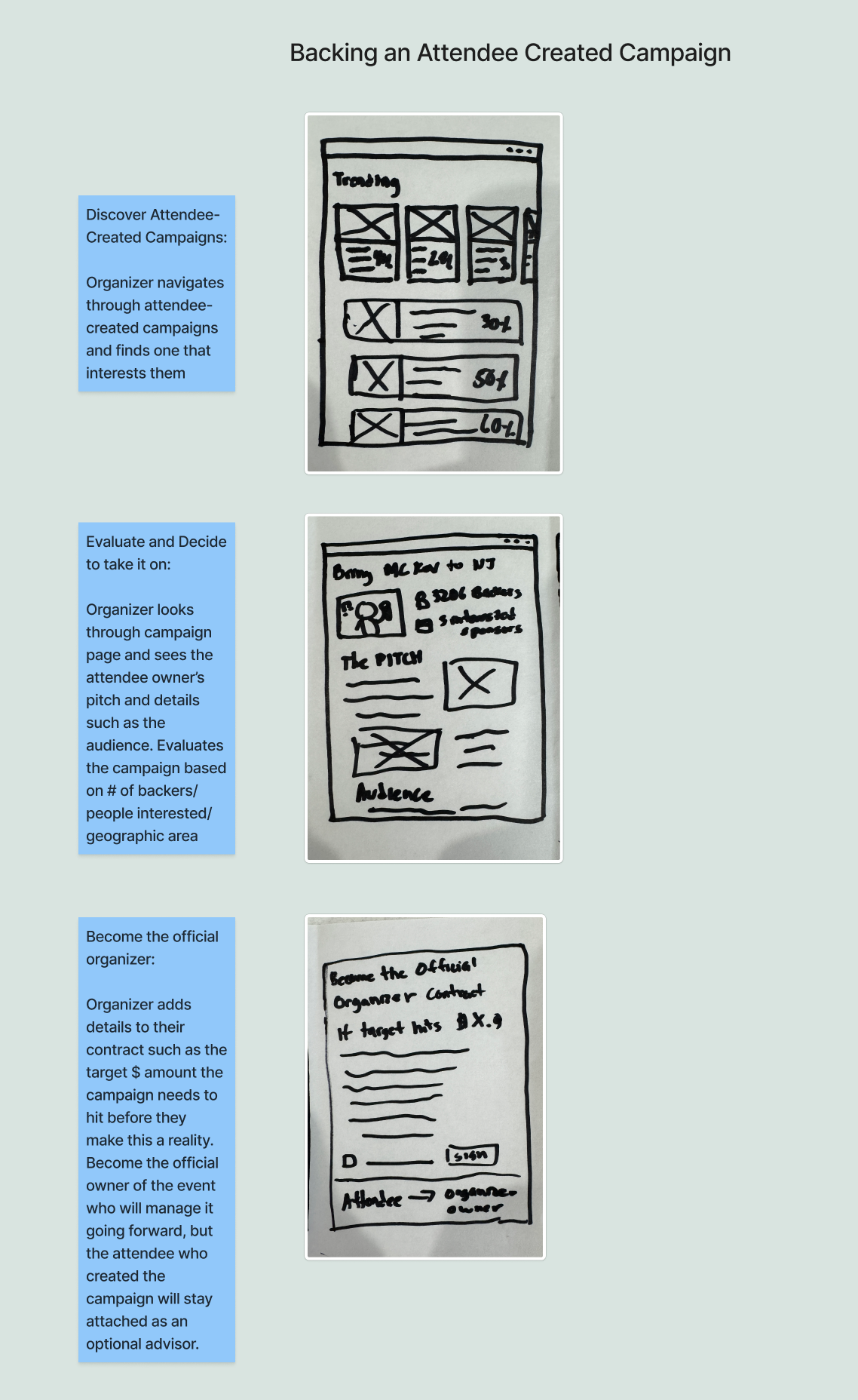 That said, my own sketches, though less polished in presentation, offer more room for imagination and inspiration when informing future designs. For my storyboard, I chose to focus on the flow for Event Organizers backing an Attendee-created campaign.