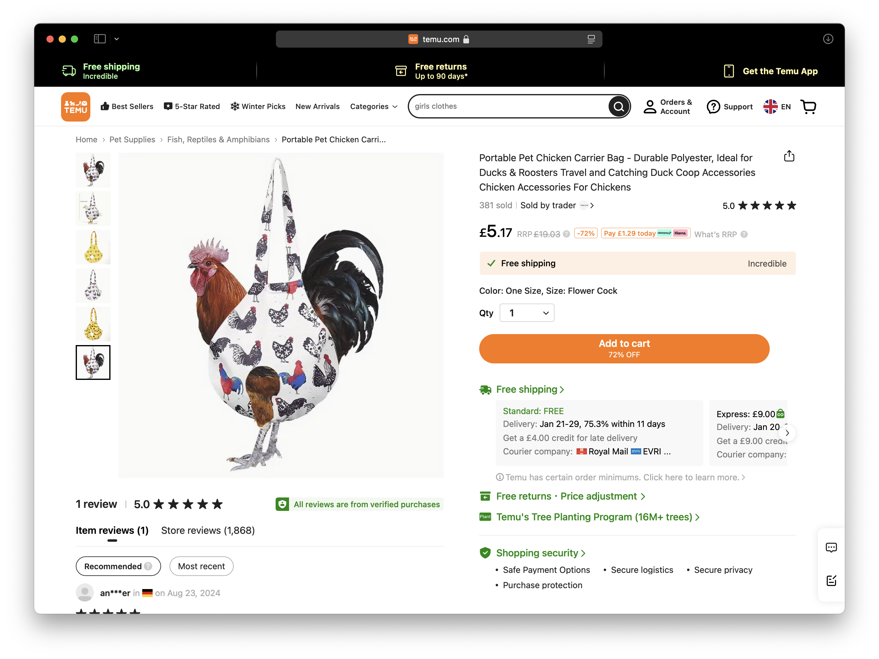 I was browsing an online marketplace the other day because I was a bit bored, and because I have a unique need to seek out dark patterns. Something caught my eye as I scrolled. Amongst all the other suspiciously cheap items, was a bag for a chicken. Not a bag with a chicken pattern, not a bag shaped like a chicken, no — a bag to carry a chicken. A living chicken. A bag for carrying a chicken.
