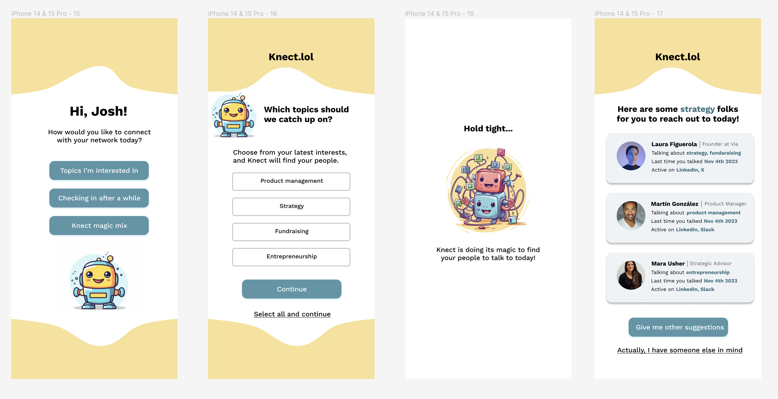 This seemed like a good time to interview Josh to understand his problems and vision for Knect. Josh expressed his frustrations with current solutions and brilliantly distilled what he wants in a high level solution: